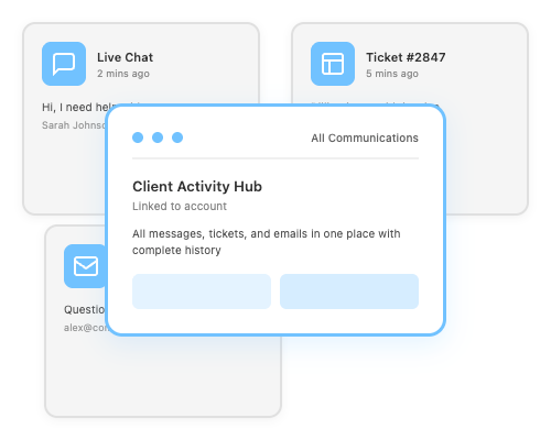 Live chats, tickets, and emails merge automatically into each client’s profile.