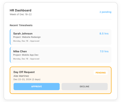 Every HR activity connects seamlessly to daily operations. Team members log hours, request leave, and sync meetings directly with projects, no separate systems required.